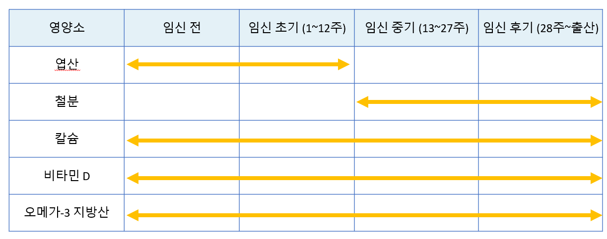 "엽산, 철분, 칼슘, 비타민D, 오메가3"입니다. 임신 시기별로 먹어야 하는 영양제를 표로 만들어보았습니다.