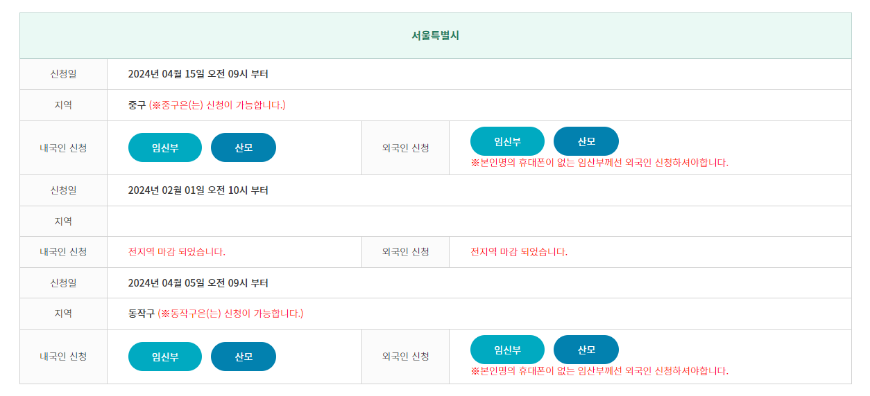 본인의 지역과 신청기간을 확인하고, 임신부인지 산모인지를 선택하시면 됩니다.