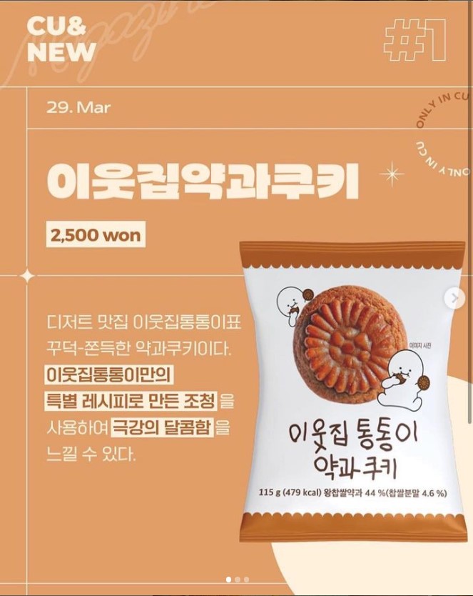 CU는 3월 말 서울 압구정로데오 지역 인기 "이웃집 통통이"와 협업하여, 약과 쿠키를 판매하고 있습니다.